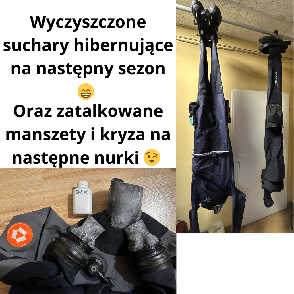 Manszety lateksowe lub neoprenowe spłucz dokładnie wodą z płynem do naczyń lub mydłem, a po wyschnięciu talkujemy je, by zapobiec sklejaniu i pękaniu. Skafander susz na wieszaku o szerokich ramionach lub powieszonym za nogi, w zacienionym, przewiewnym miejscu, z daleka od grzejników i bezpośredniego słońca. Przechowuj go częściowo rozpiętego, aby nie napinać zamka i materiału.